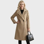 Nadčasový design: Široké klopy dodávají kabátu dramatičnost a eleganci, zatímco čistá zadní část s jemným detailem pásku působí velmi minimalisticky.