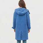 Model Olivia je lékem na zimní šedou. Tento kabát v zářivém odstínu "electric blue" okamžitě oživí váš šatník i náladu. Je vyroben z materiálu s výraznou strukturou (styl bouclé/vařená vlna), který je nejen vizuálně zajímavý, ale také úžasně měkký a hřejivý. Díky volnějšímu střihu a velké kapuci se do něj můžete zachumlat a cítit se jako v bavlnce, ať už jdete do práce nebo na zimní procházku.
