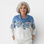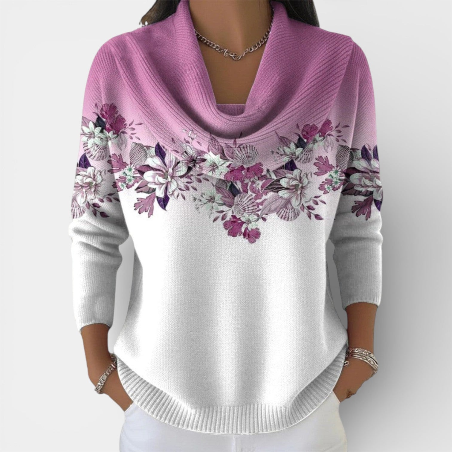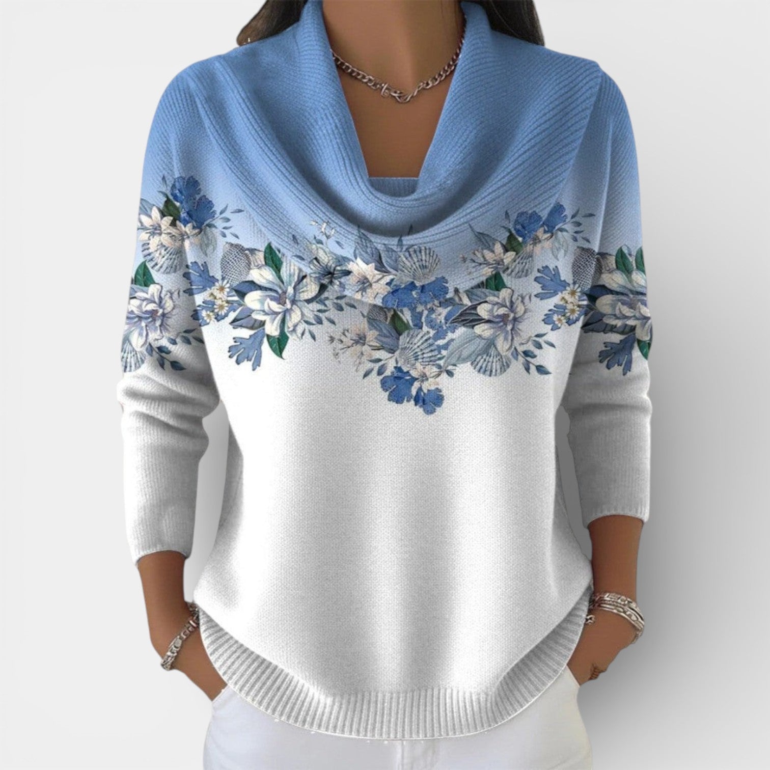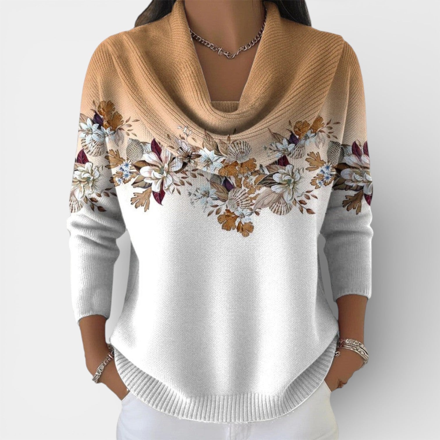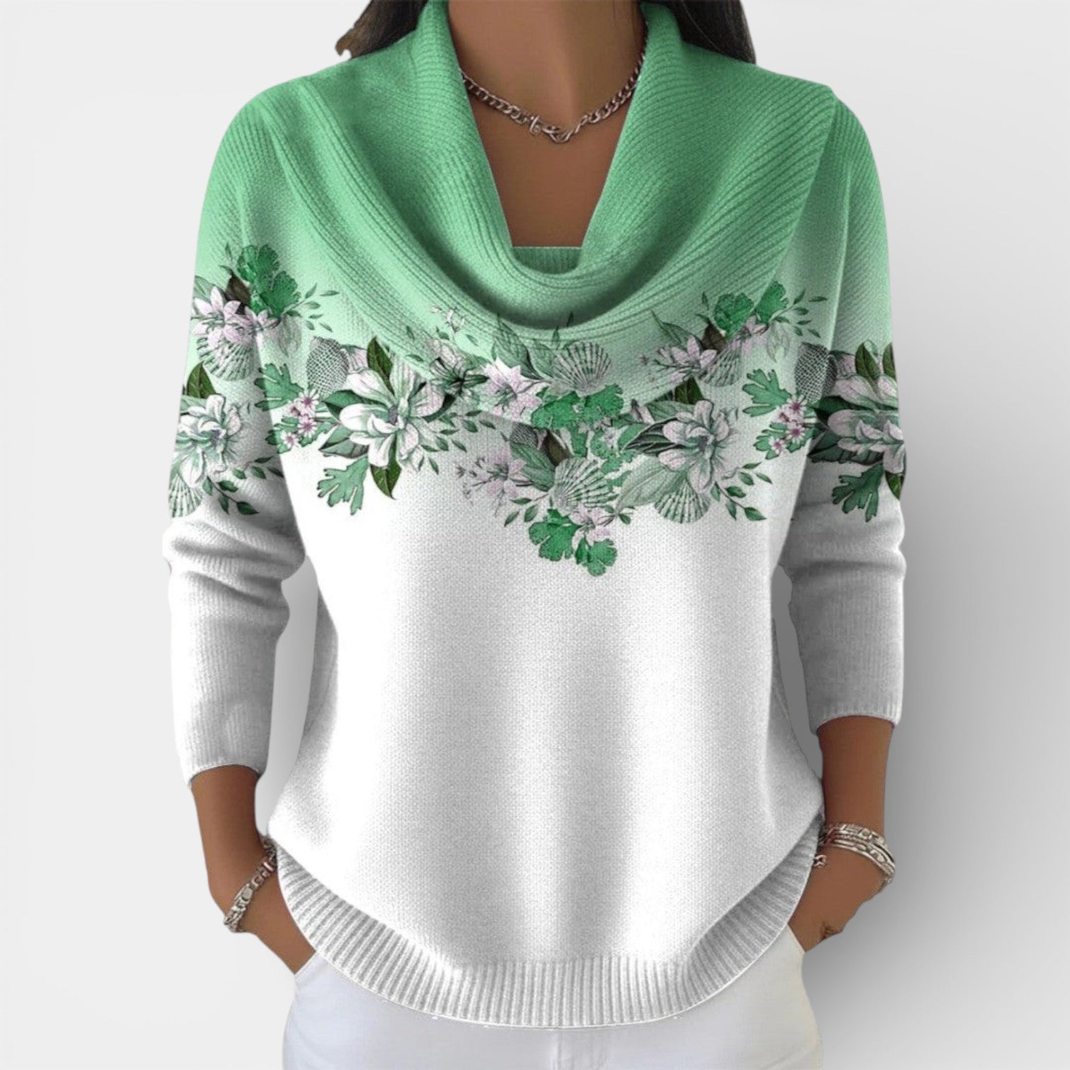 Jemný design: Botanický potisk v horní části přitahuje pozornost k tváři a dodává svetru ženský a romantický nádech.