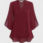 Halenka Petra kombinuje lehký šifon s jemnou strukturou a volnější V-liniový střihem, který krásně padá a opticky tvaruje postavu bez sevření. Decentní výstřih a jemné záhyby na ramenech dodávají kousku šmrnc, zatímco outfit zůstává minimalistický – ideální v kombinaci s džíny, sukní nebo kalhotami pro stylový, ale nenucený vzhled.