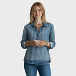 Model Elise je mistrovským dílem optické iluze a pohodlí. Na první pohled vypadá jako propracovaný outfit složený z vlněného svetru s copánkovým vzorem a džínové košile. Ve skutečnosti jde o jedinou, lehkou a měkkou tuniku, která vám zajistí dokonalý "vrstvený vzhled" bez zbytečného objemu a horka. Je to ideální řešení pro ženy, které milují styl, ale upřednostňují jednoduchost a komfort.