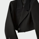 Minimalistické krátké sako s elegantním designem a moderními detaily. Límec s ostrými liniemi a přední zapínání dodávají dynamický charakter, zatímco krátká linie ho činí ideálním pro stylové vzhledy. Snadno se nosí jak na pracovní, tak i na večerní příležitosti.